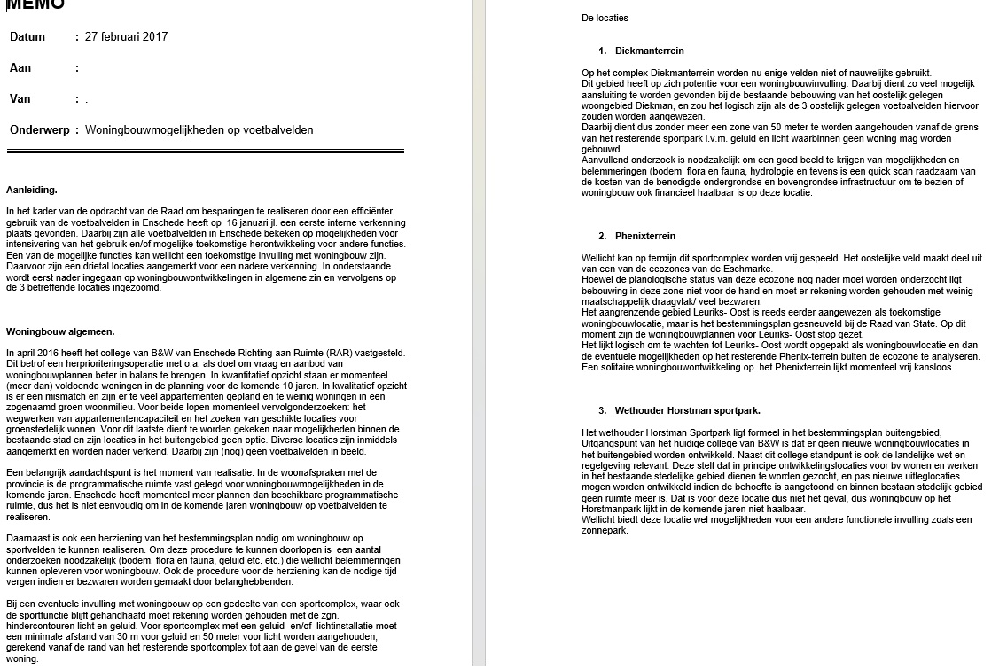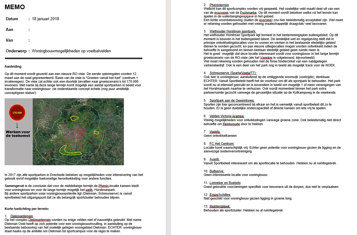 De aanleiding was inderdaad een taakstelling om € 100.000 structureel te bezuinigen door efficiënter gebruik te maken van voetbalvelden. Ambtelijk is dit echter gekoppeld aan een toekomstige invulling met woningbouw.