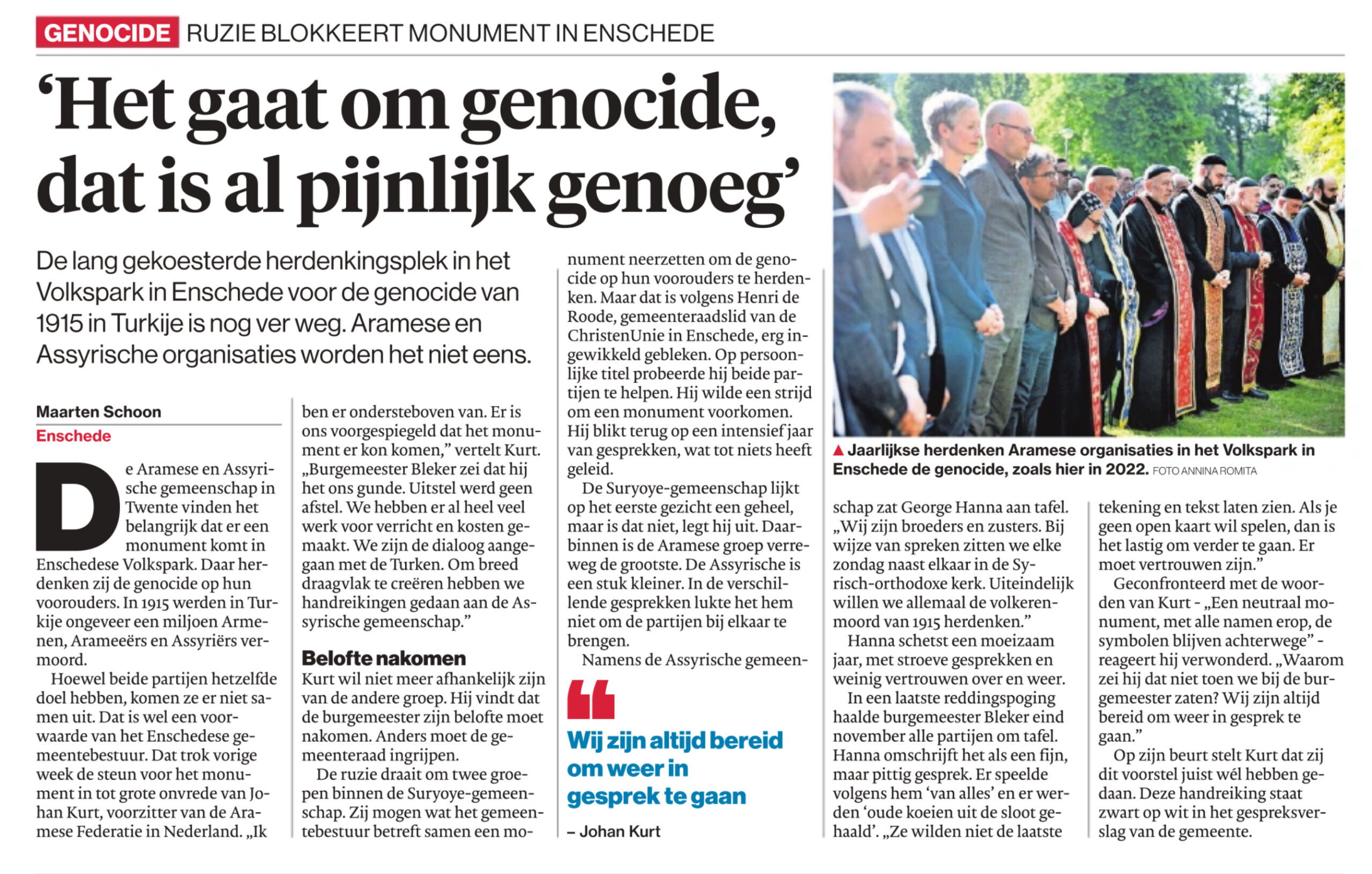 April 2023 schreef ik reeds een column over genocidemonument dat de Armeense Syrisch-orthodoxe gemeenschap in ons Enschedese Volkspark wil. Daarnaast is er een brief gestuurd naar alle raadsleden van de Gemeente Enschede.