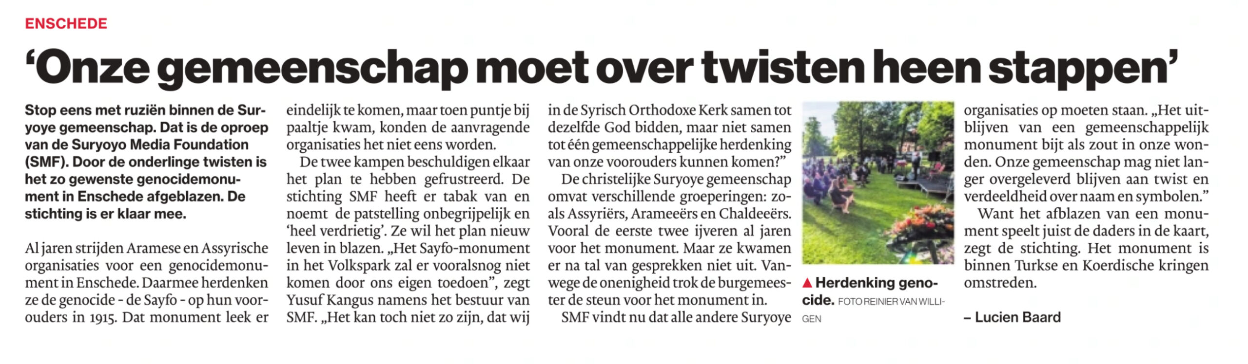 In de eerste twee alinea’s’ van dit artikel wordt de moeilijkheid wat dat betreft reeds blootgelegd. Er wordt aangegeven; “Al jaren strijden Aramese en Assyrische organisaties voor een genocidemonument in Enschede” en dat er moet worden gestopt met “ruziën binnen de Suryoye gemeenschap” volgens de stichting Suryoyo Media Foundation (SMF).