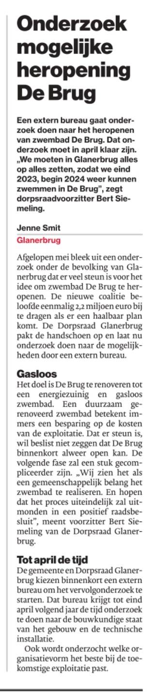 Waar ook niets over werd gezegd. De bewierookte MultiFunctionele SportAccommodaties dat inmiddels ‘on hold. staat. Niets over de status van de megalomane huiskamer van de stad aangezien de Bibliotheek-plannen ogenschijnlijk toch niet doorgaan. Niets – behalve een eenmalige fooi gereserveerd in het investeringsfonds – en een klein kranten artikel (ook) 2 dagen na de begroting – over het zwembad De Brug. Laat staan over de status van welk zwemwater dan ook. Maar wel proberen extra geld te ritselen – zonder onderbouwing of visie en zonder exploitatieplan – voor tot nu toe onrendabel bevroren water.