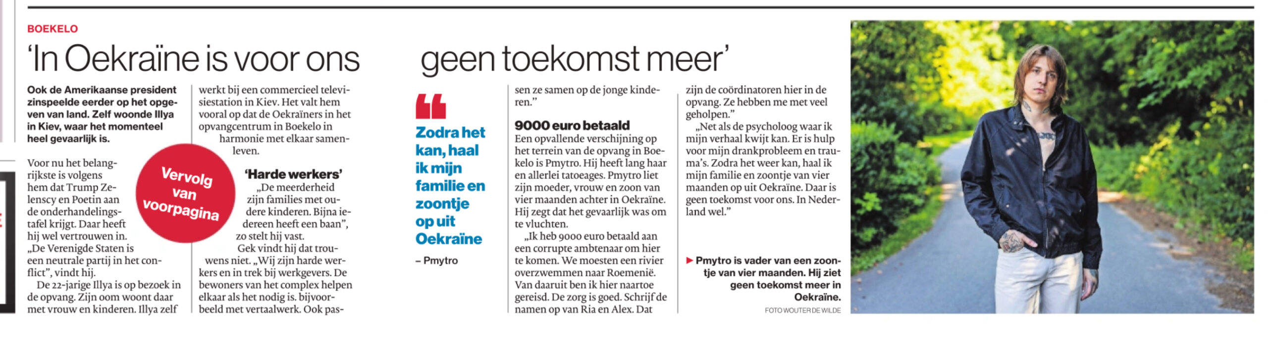 Een opvallende verschijning op het terrein van de opvang in Boekelo is Pmytro. Hij heeft lang haar en allerlei tatoeages. Pmytro liet zijn moeder, vrouw en zoon van vier maanden achter in Oekraïne. Vluchten was volgens hem te gevaarlijk.