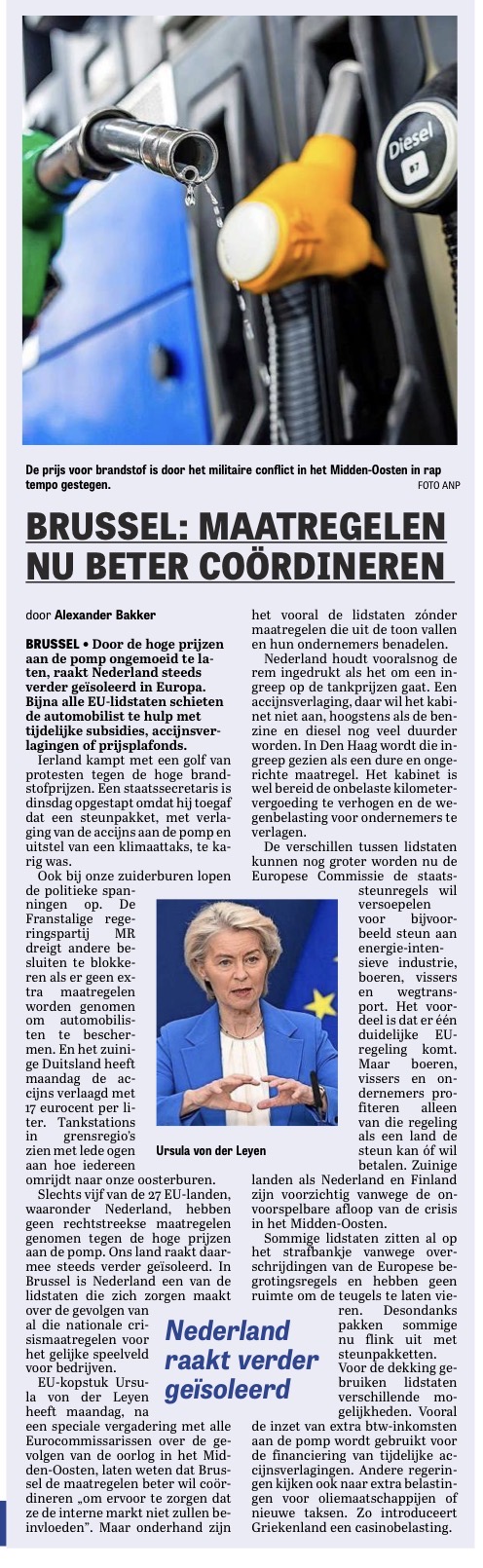 Het artikel in de Telegraaf opent met de constatering: “Door de hoge prijzen aan de pomp ongemoeid te laten, raakt Nederland steeds verder geïsoleerd in Europa.” In combinatie met de kop — ”Brussel: maatregelen nu beter coördineren” — wordt de onderliggende strategie zichtbaar. Nationale keuzes maken plaats voor Europese afstemming. Stap voor stap, dossier voor dossier.