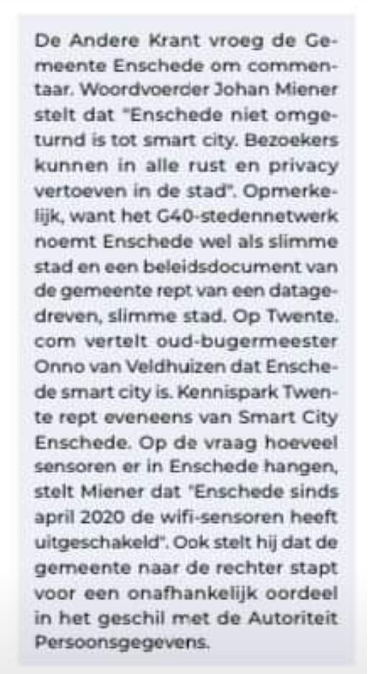 Wat betreft dat ‘smart’. Dat we een Smart City zijn wordt ontkend door woordvoerder van de gemeente Enschede Johan Miener. Opmerkelijk omdat dit in 2017 gewoon werd toegegeven. Er in 2016 (en eerder) over werd gecommuniceerd. Maar wellicht dat Johan Miener zijn reactie beïnvloed is door de WiFi tracker boete die Enschede boven het hoofd hangt. Een WiFi tracking boete nog uit de tijd van Burgermeester Onno van Velthuizen.