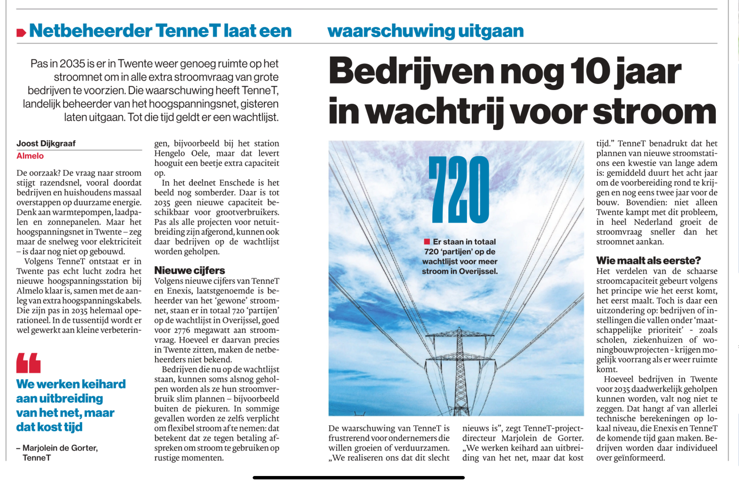 En nu? Nu dreigt Enschede alsnog speelbal te worden van projectontwikkelaars en overheden die vooral denken in opwek, doelstellingen en subsidies. Maar wie het nieuws deze week volgde, weet dat zelfs dat een illusie is. TenneT heeft het zwart op wit gezet: pas in 2035 is er in Twente voldoende netcapaciteit om nieuwe stroom aan te kunnen. Tot die tijd? Wachtlijsten en wachtruimtes. Je kunt wel opwekken, maar vervoeren lukt niet.
