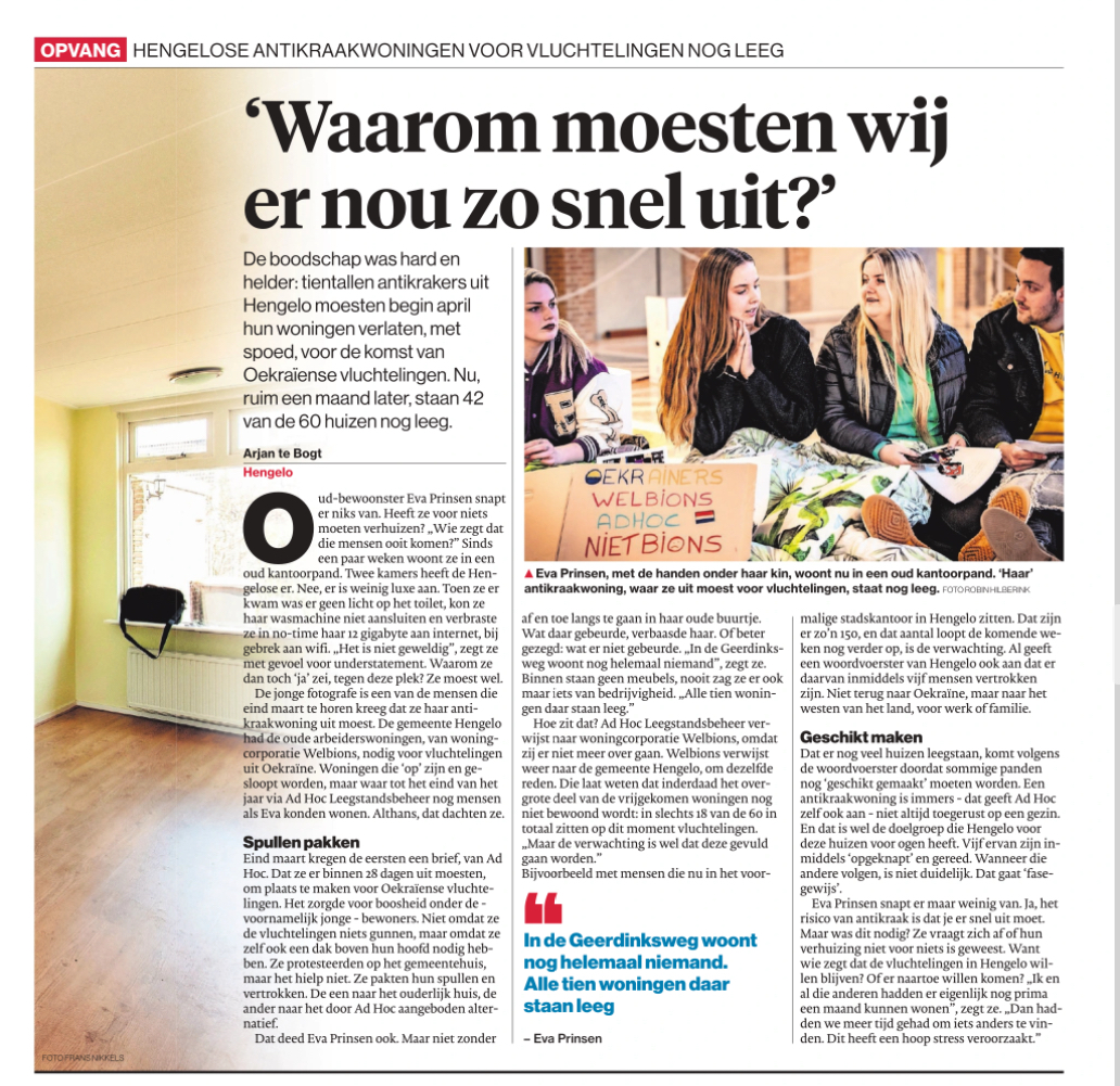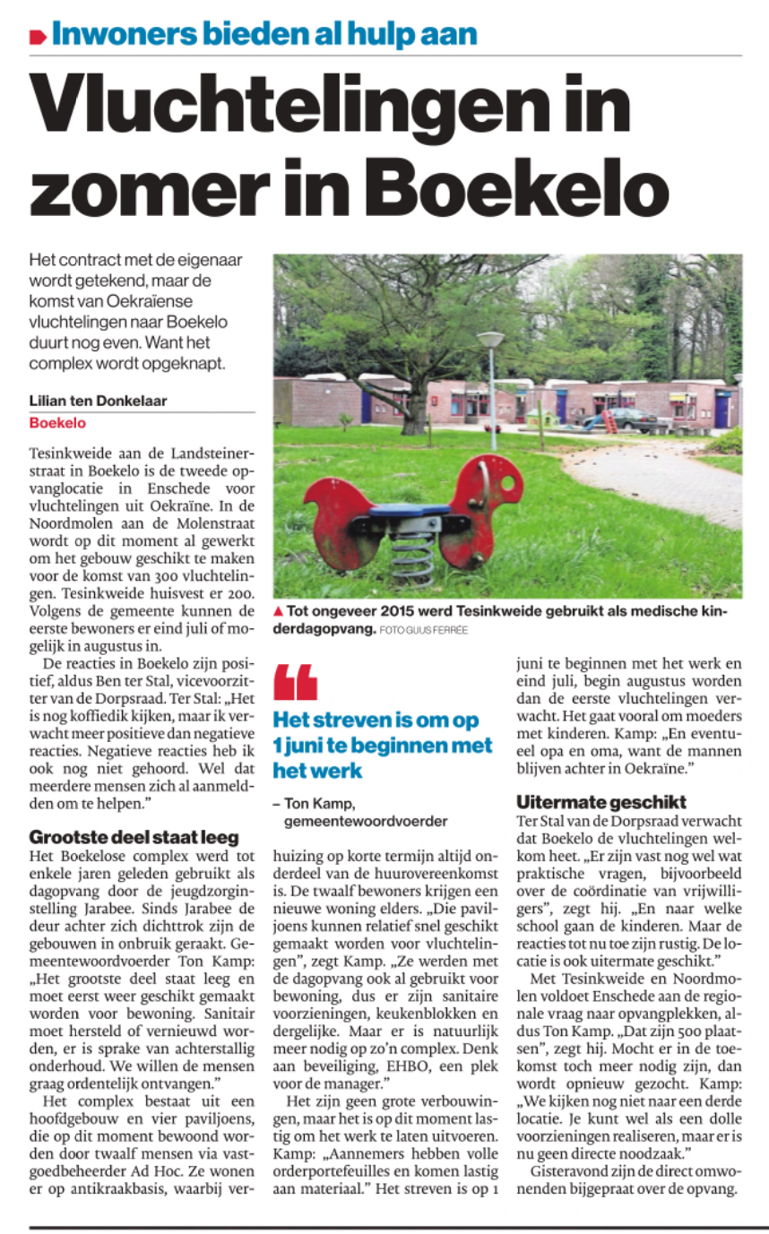 12 mensen moeten nu vertrekken uit Boekelo en enkele tientallen moesten reeds met spoed vertrekken uit Hengelo. In Hengelo staan er nu 42 van de 60 woningen leeg en in Enschede is er straks plek om 500 (300 Noordmolen /200 Tesinkweide) Oekraïners op te vangen. En al gaat door onderschatting van de bijkomende problemen de opvang van Oekraïners door particulieren niet altijd even soepel. De opvang voor Oekraïners, gevlucht voor oorlog en geweld verloopt in zijn algemeenheid prima en er zijn ruimschoots plekken.