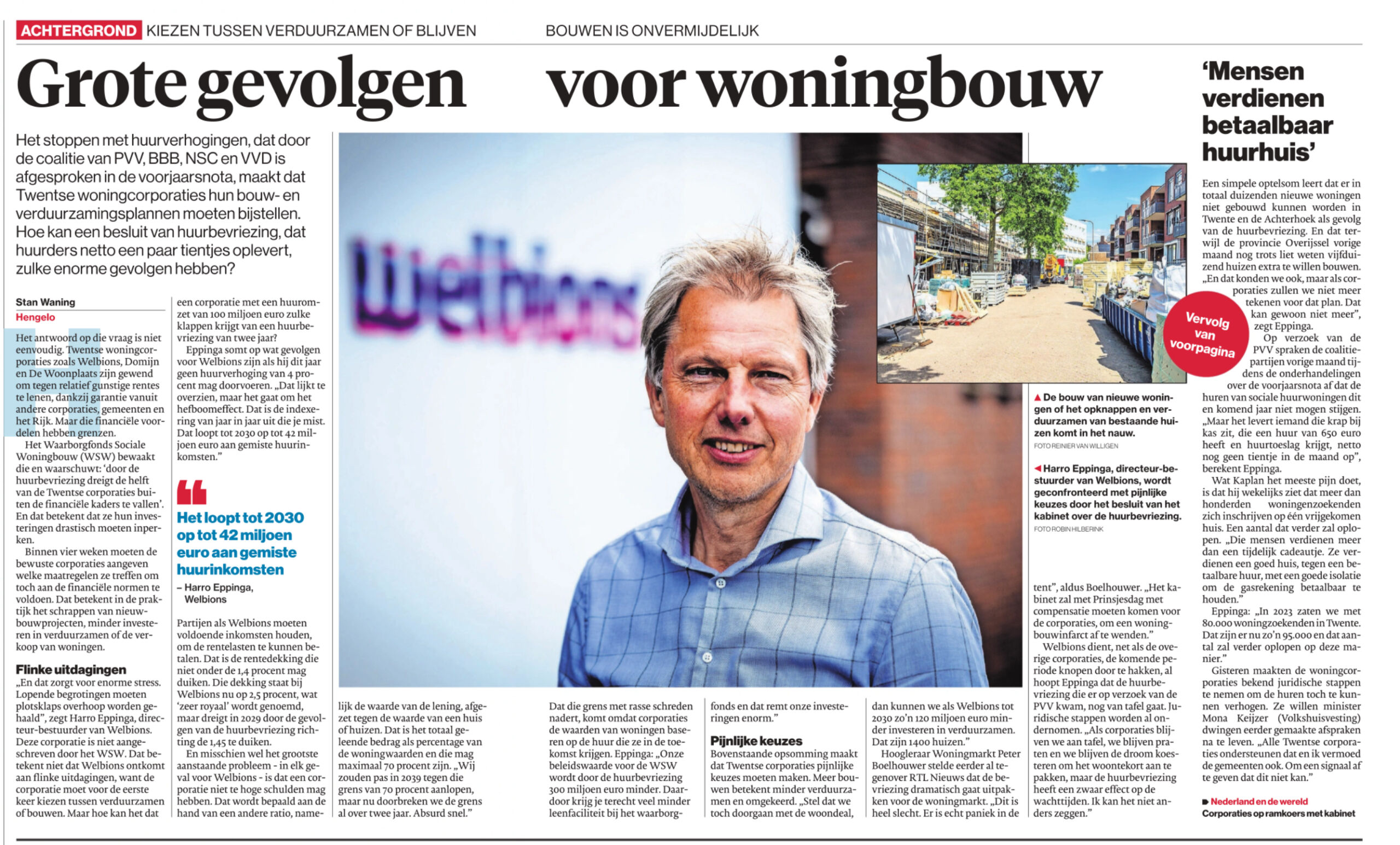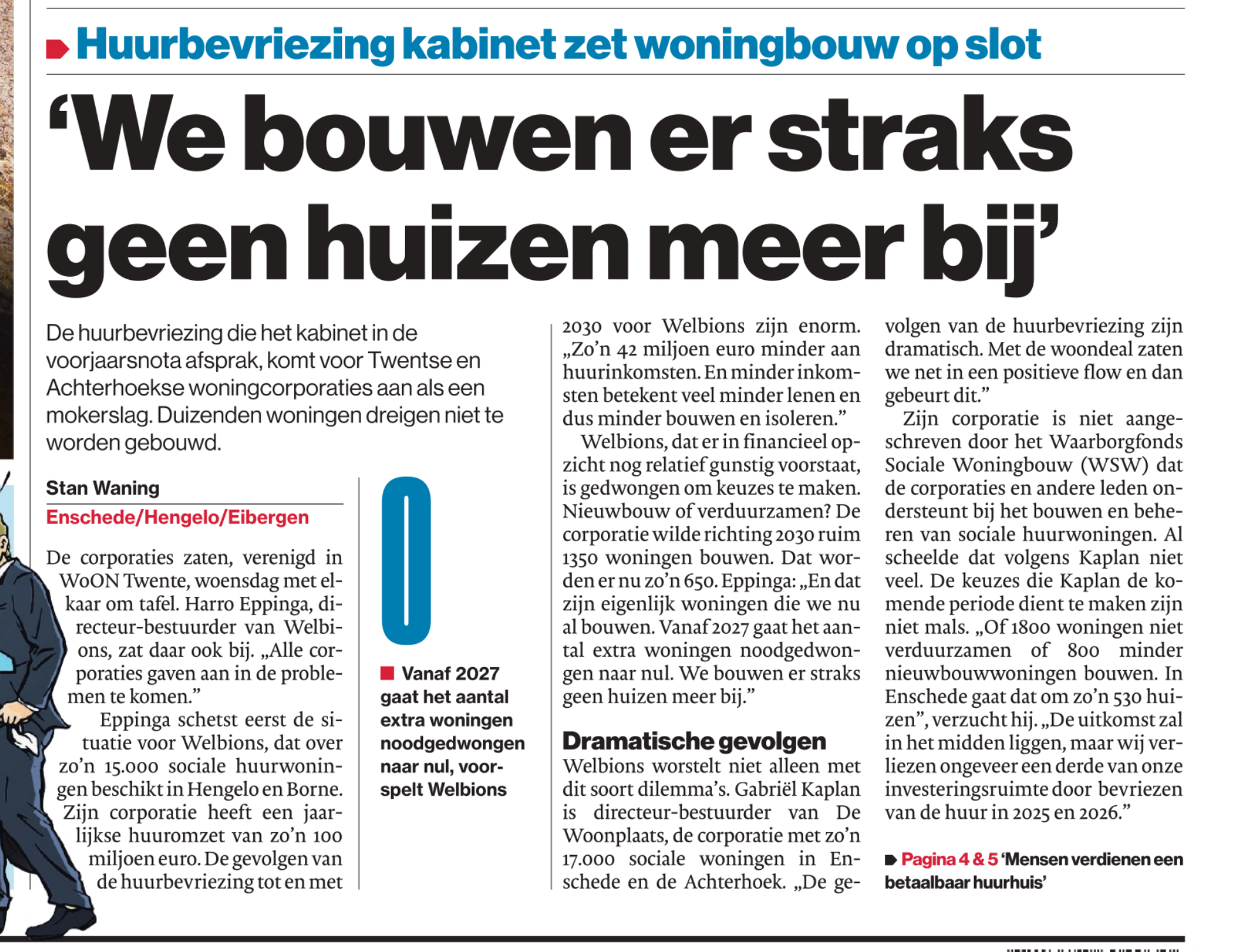 De woningcorporaties zijn een verlengstuk van dit jarenlange vernietigende beleid [ 1 ]! Maar, dit kabinet (PVV, VVD, NSC, BBB) maakt er een zooitje van. Huurbevriezing, stikstofregels, en een stuurloos beleid dat Twentse corporaties [ 1 ] [ 2 ] zoals Welbions, Domijn en De Woonplaats financieel wurgt. Niet de huurbevriezing zelf is het probleem, maar de starre kaders van het Waarborgfonds Sociale Woningbouw (WSW).