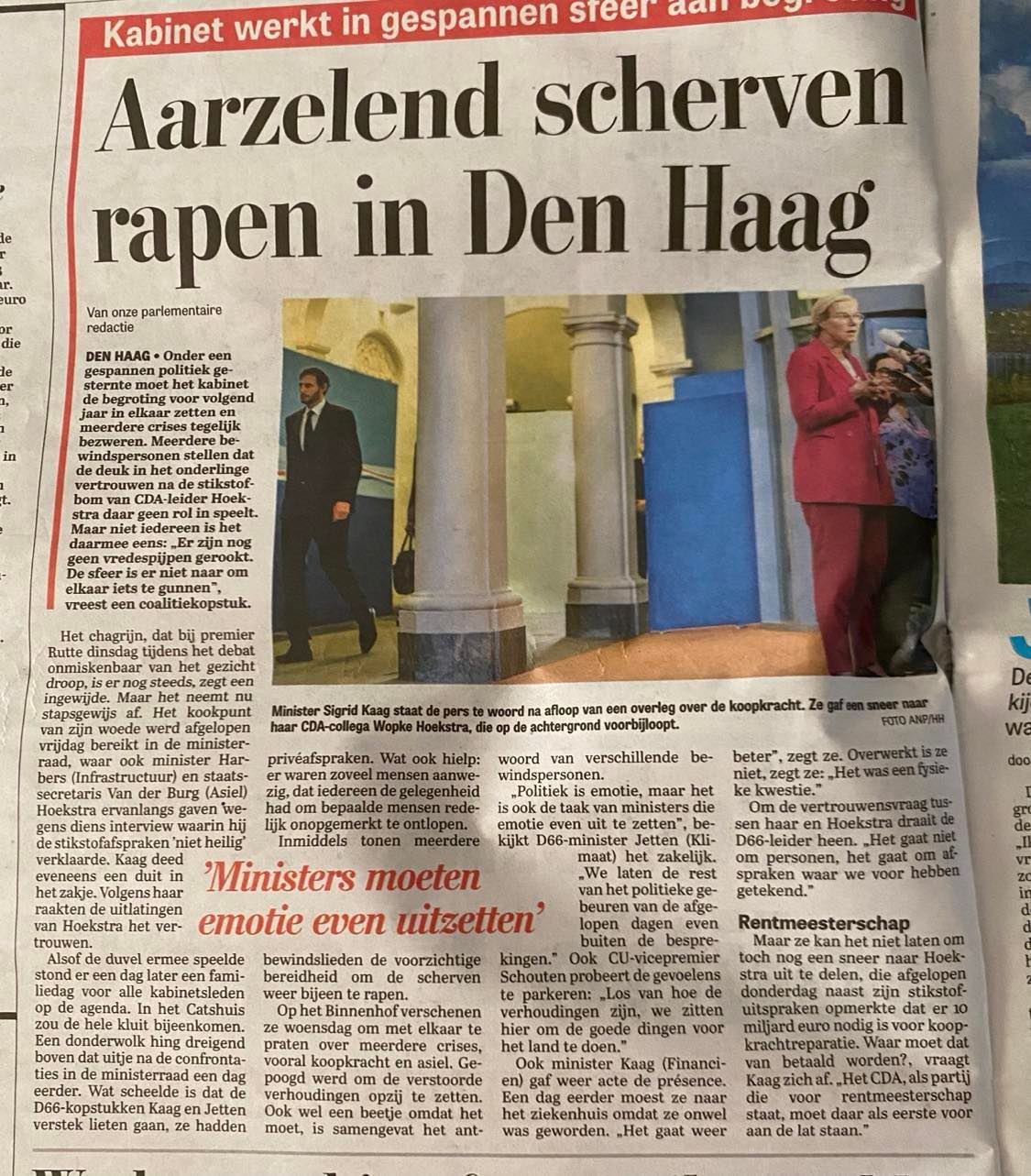 Het laat wat mij betreft wel zien hoever bestuurders als kortKAAGJE van de werkelijkheid afstaan en: minachting van de kiezer, gebrek aan medeleven en geen greintje empathie. En zoals Rob Jetten het zo treffend zegt, ministers moeten de emotie even uitzetten.