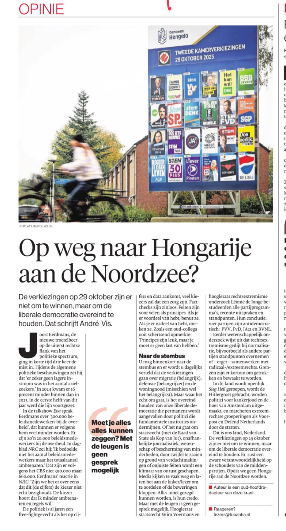 De reden om bewust ‘liberale democratie’ te noemen is een politieke. Andre Vis is oud hoofdredacteur van de Tubantia. En de huidig hoofdredacteur is Daan Bonenkamp was voorheen actief voor D66. Dat hij de politieke jas uit zou hebben gedaan, is moeilijk vol te houden gezien zijn publieke optredens en themakeuzes. Hij heeft slechts een ander masker opgezet.