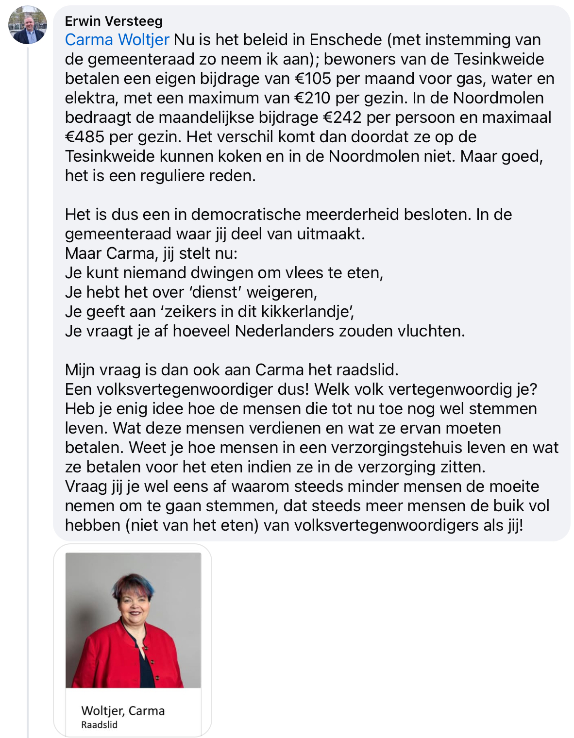Dat de fractie Van Ek/Woltjer het prima vindt, was te verwachten. Voor hen zijn Nederlanders en Enschedeërs immers “dienstweigeraars”, “zeikers in dit kikkerlandje” en “mensen die Oekraïners dwingen om vlees te eten”.