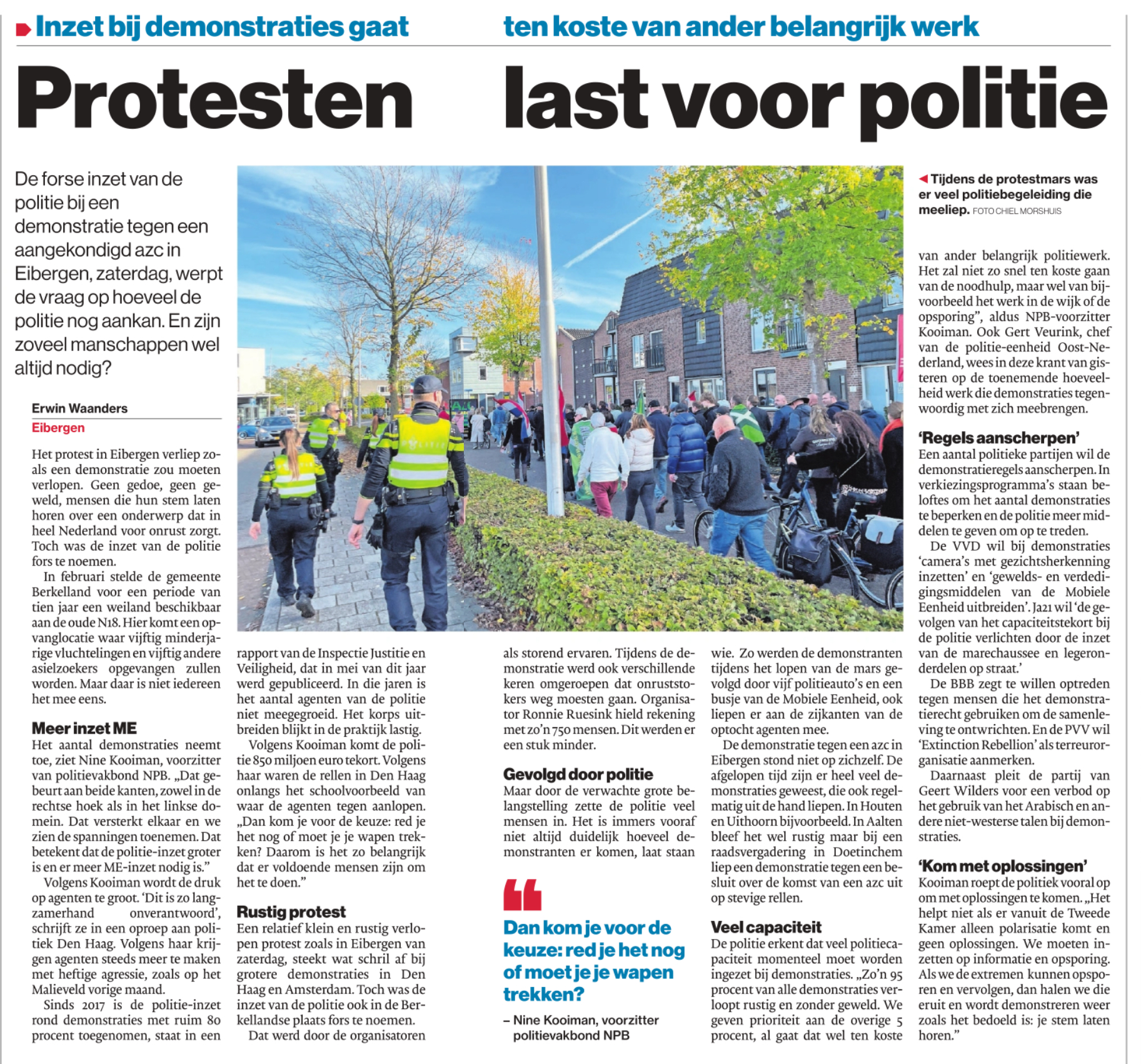 In dit artikel zegt Nine Kooiman, voorzitter van de politiebond: “Dan kom je voor een keuze te staan; red je het nog, of moet je je wapen trekken?”