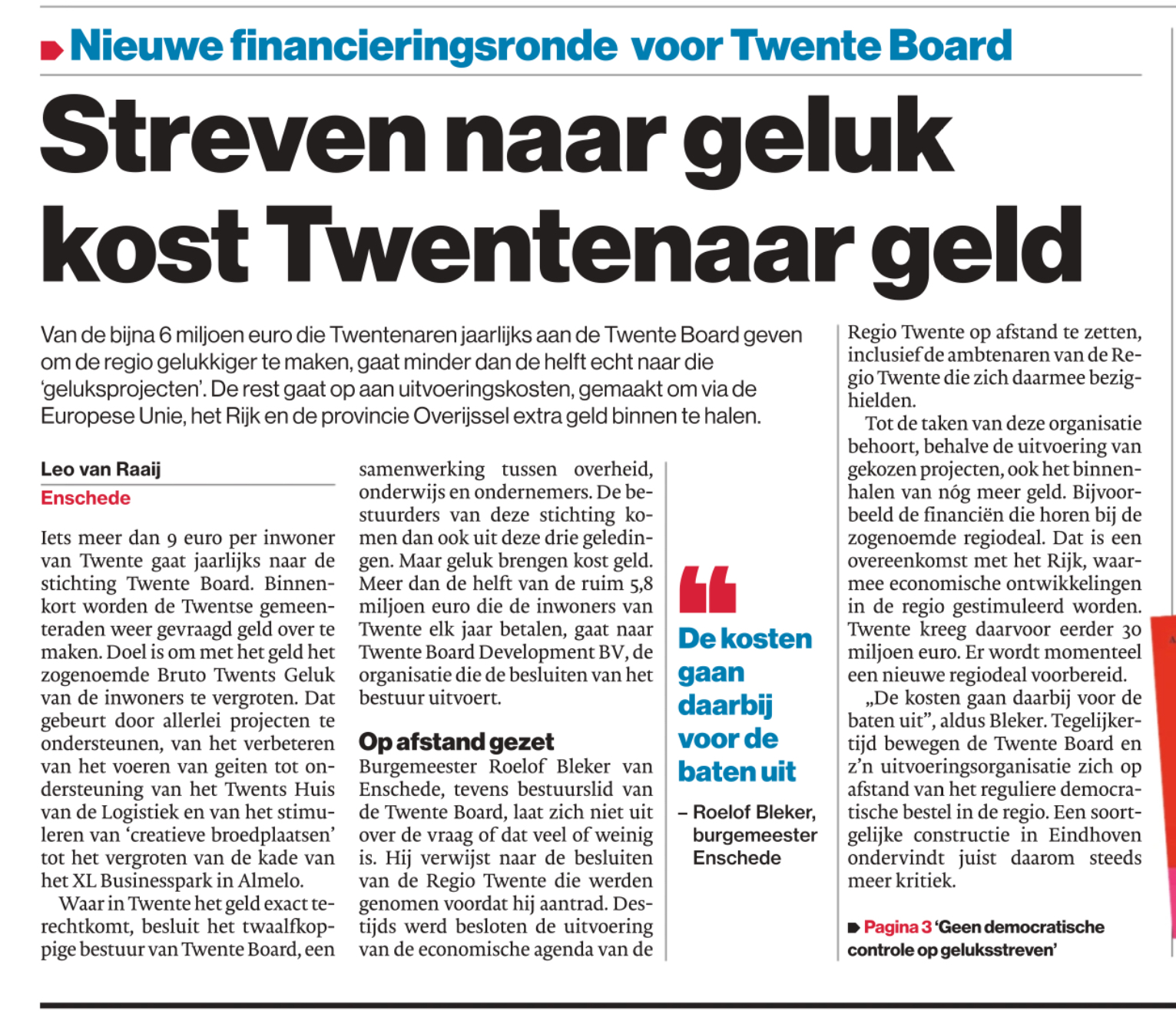 Wat in Enschede begon met € 7,50 per inwoner gaat nu inmiddels volgens het artikel in TC Tubantia iets meer dan € 9,- per inwoner worden. In het voorstel dat aan de Enschedese raad is voorgelegd wordt nu € 9,27 voor de regio Twente en de Stichting Twente Board gevraagd. En deze € 5.833.462,68 PER JAAR zijn dan bestemd om het Bruto Twents Geluk van alle inwoners in Twente te vergroten. Totaal id dus met dit raadsvoorstel bijna € 30 miljoen gemoeid.