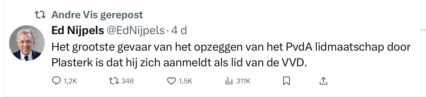 Het is des te schrijnender dat uitgerekend een voorstander (en Nijpels retweeter) van ‘PvdA/GroenLinks’ als Vis zich beroept op Locke, en dat dit naadloos aansluit bij het gedrag van partijen als VVD, D66 en GroenLinks/PvdA. Wat deze partijen delen, is niet ideologie, maar bestuursdrift. Ze geloven niet in het corrigeren van de macht door de burger – ze geloven in het opvoeden van de burger door de macht. Ze vormen een links-liberaal kartel dat zich met dezelfde vanzelfsprekendheid keert tegen nationale soevereiniteit, tegen volksinvloed, en tegen politieke verantwoording.