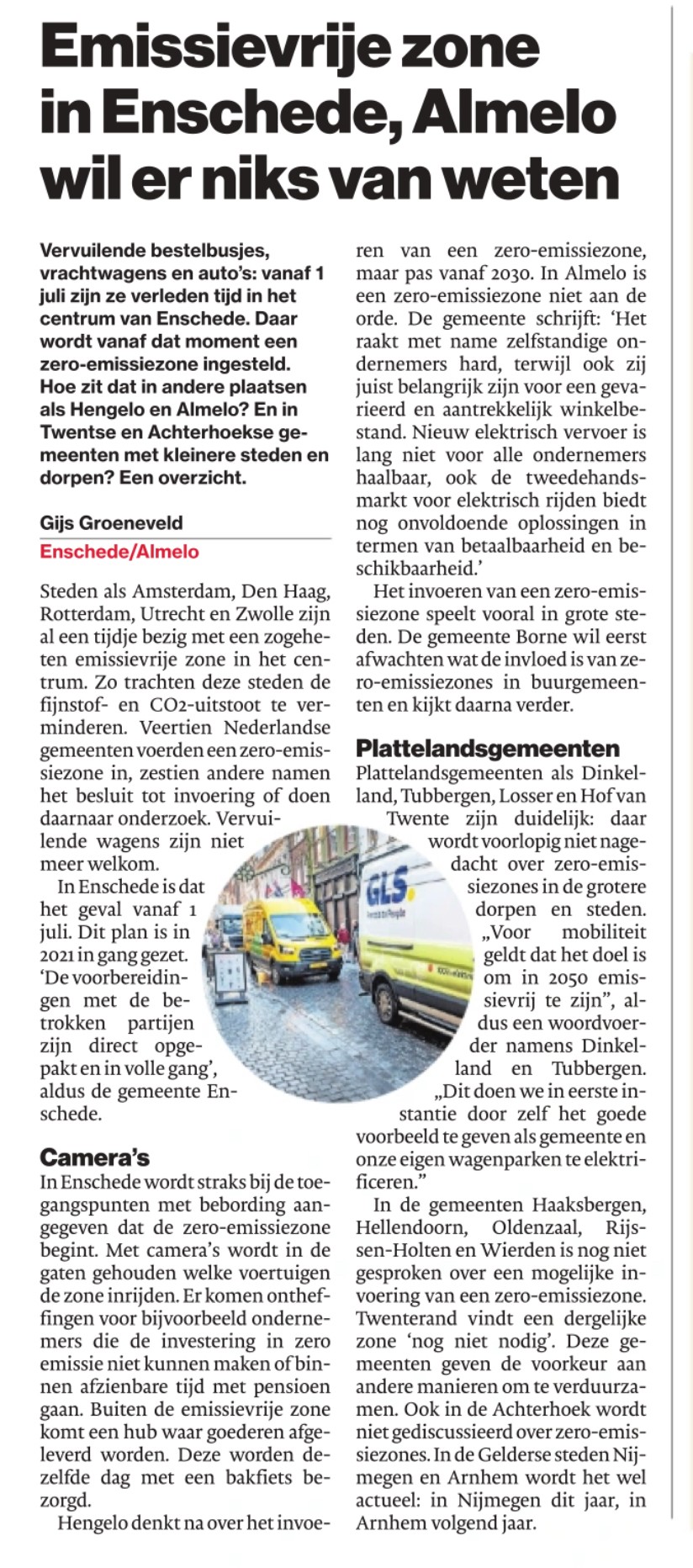 In het artikel in de TC Tubantia wordt gesteld: “met camera’s wordt in de gaten gehouden welke voertuigen de zone inrijden”. Nu is op papier de bedoeling van zero-emissie het uitstoten van CO2 zo veel mogelijk te beperken. Deze omvangrijke bezuinigingsexercitie leidt tot een CO2 uitstootbeperking gelijk aan de halfjaarlijkse uitstoot van één gezin zoals is uitgerekend door 1Twente.