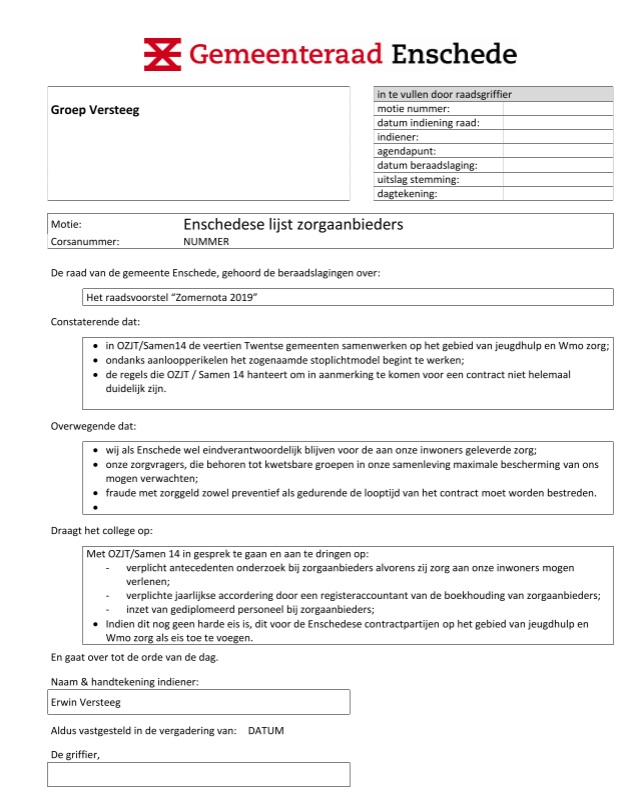 3. Na veelvuldig afgeven van signalen heeft Groep Versteeg bij de zomernota 2019 uiteindelijk nog een motie ingediend. Dit met als doel om de misstanden die reeds duidelijk waren daadwerkelijk aan te pakken en te stoppen. Voor de motie hebben gestemd: Enschede Anders, CDA, SP, PVV en Groep Versteeg. Wat was er op dat moment al bekend over de misstanden, hoe verhoudt zich dat tot de informatie verstrekking aan de raad en had de uitvoering van deze motie, bij kunnen dragen aan het eerder opsporen en stoppen van de misstanden zoals die nu in het rapport worden beschreven.
