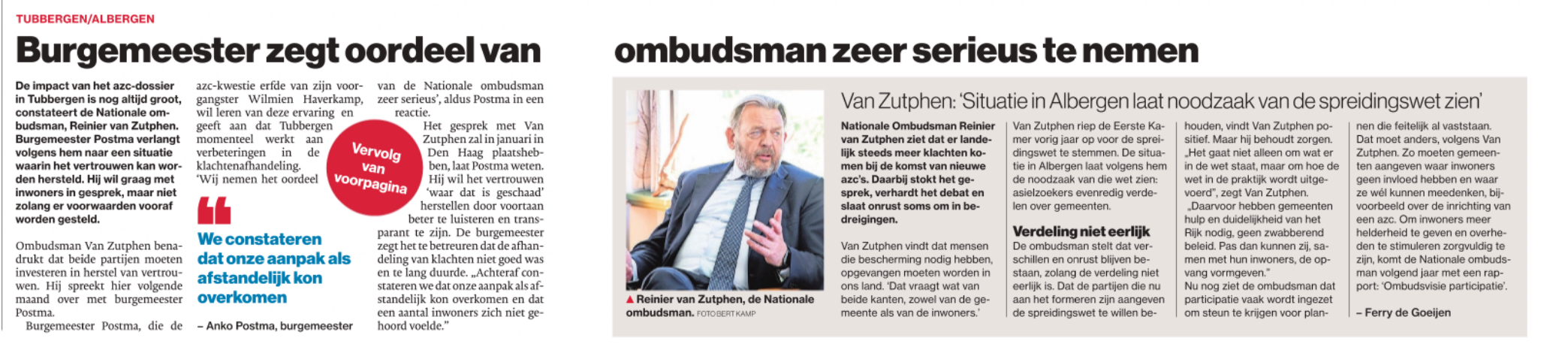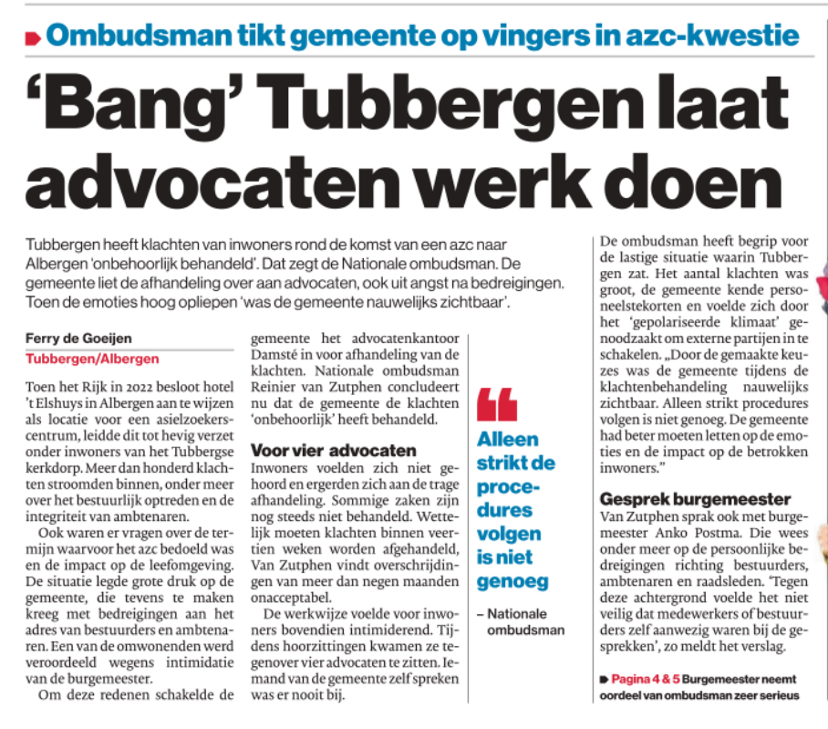 Burgemeester Postma zegt [ 1 ] [ 2 ] graag met inwoners in gesprek te willen — maar niet zolang er voorwaarden vooraf worden gesteld. Die ene zin legt pijnlijk precies bloot waar het in Tubbergen, Albergen en inmiddels in heel Nederland misgaat.