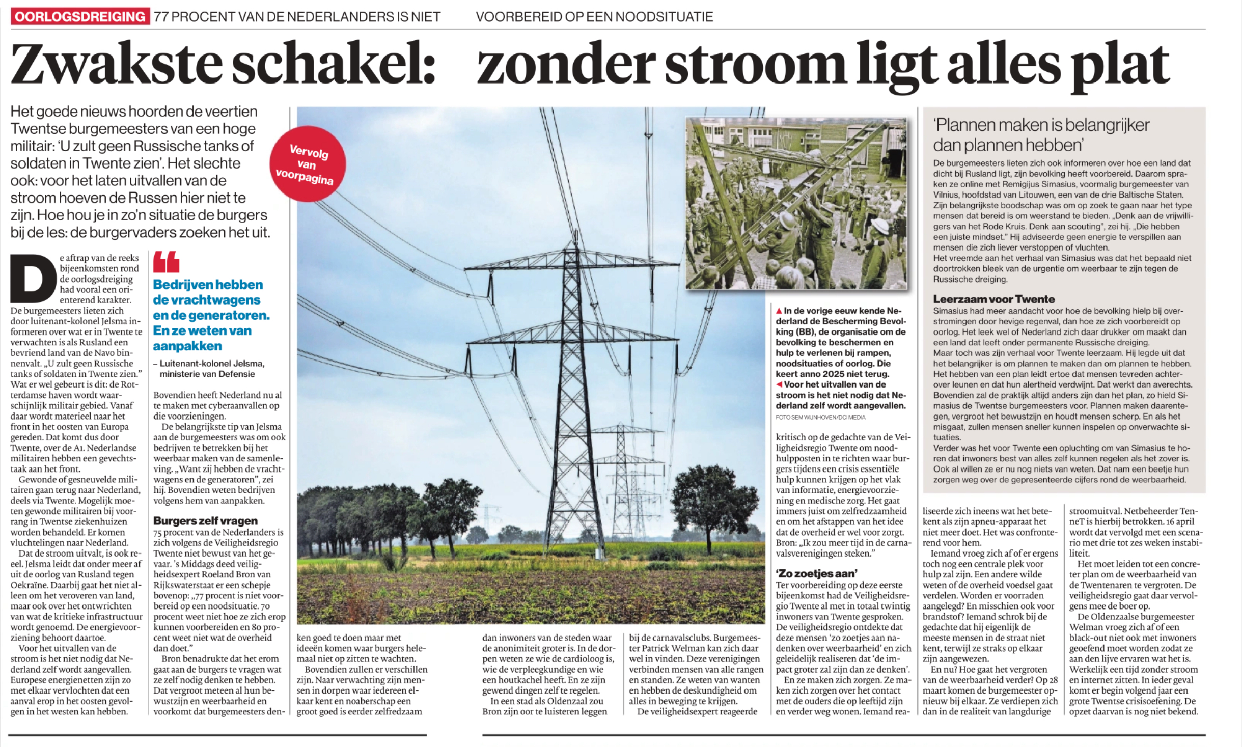 Door dat te verzwijgen, wordt de aandacht afgeleid van de echte zwakke schakel: ons stroomnet. De reeks bijeenkomsten over oorlogsdreiging heeft vooral een oriënterend karakter. “U zult geen Russische tanks of soldaten in Twente zien,” zo wordt geruststellend gezegd.