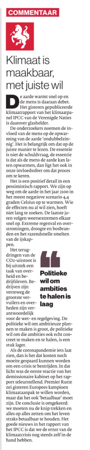 Deze week was er het klimaatrapport van het klimaatpanel van de IPCC. De groene activisten buitelden natuurlijk over elkaar heen in de groen aangestuurde praatprogramma’s met natuurlijk de groene politici. Wat mij opviel was een kop in de TC Tubantia artikel COMMENTAAR ‘klimaat is maakbaar, met de juiste wil’.