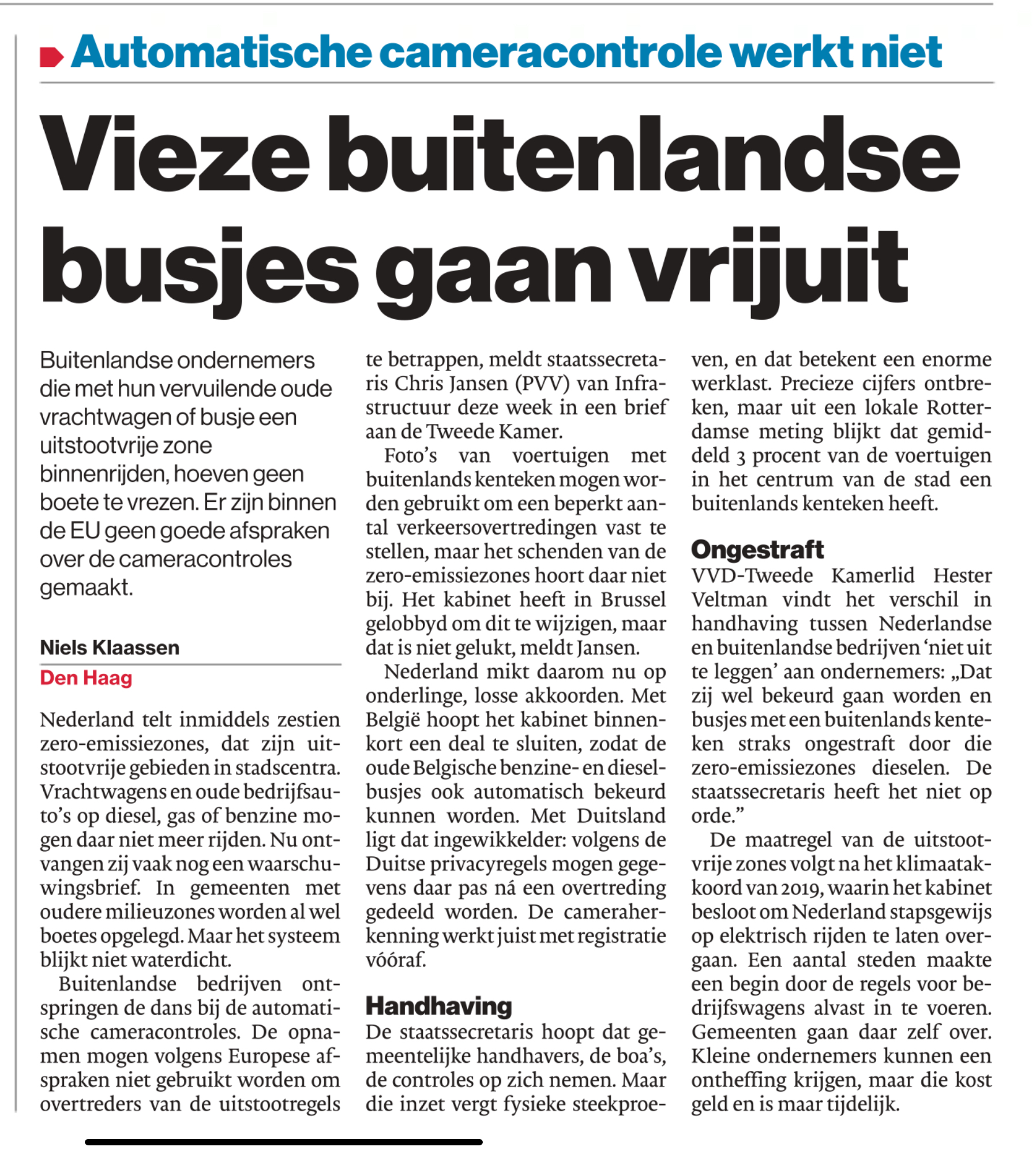Nederlandse ondernemers worden opgezadeld met torenhoge kosten, KvK-registraties en boetes als ze niet voldoen aan de strenge zero-emissieregels, terwijl buitenlandse bedrijven met hun ronkende, vervuilende busjes vrijuit gaan. En waarom? Omdat de EU weer eens geen fatsoenlijke afspraken kan maken en Nederland met slappe excuses blijft zitten. Staatssecretaris Jansen (PVV) heeft het lef om te melden dat lobbyen in Brussel mislukt is, en nu moeten overbelaste boa’s het maar opknappen met fysieke controles? Wat een lachertje. Intussen kijken beunhazen uit het buitenland in hun Belgische en Duitse dieselslurpers (zonder verplichte APK) lachend toe, terwijl onze ondernemers worden uitgeknepen.